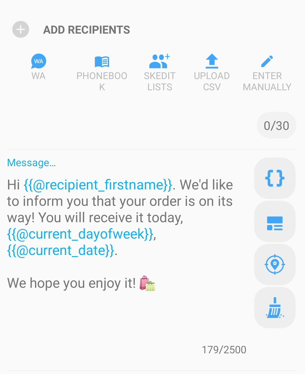 Automatic Replacement: SKEDit will handle the rest. At the time the message is scheduled to be sent, the placeholders you've used will be automatically replaced with the relevant data. For instance, if you've used the @recipient_name placeholder, it will be replaced with the recipient's actual name.