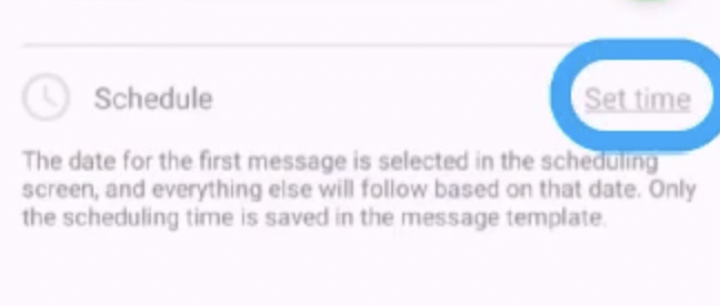 - Set the time for the first message: Tap on the "Set time" option to specify the time when you want the first message of your drip campaign to be sent. You don't have to enter the date at this stage; that will be done later when creating your schedule. You can link your drip campaign to a schedule, allowing you to define a specific date for the beginning of the drip campaign.